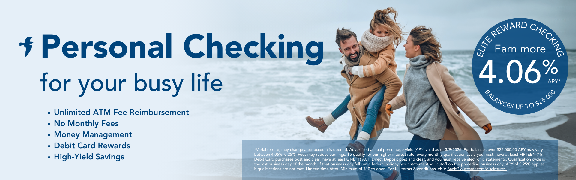 Elevate your banking experience with our diverse range of personal and business banking products including checking accounts, savings accounts, CDs, IRAs, mortgages, and loans. Benefit especially from our competitive interest rates, exceptional in-person service, and convenient online banking tools. See why BankGloucester is where dreams take flight.